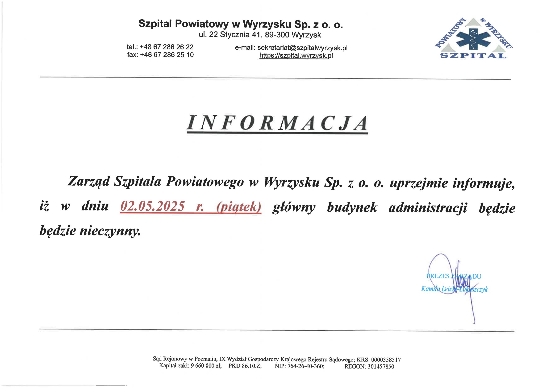Informacja Zarządu Szpitala Powiatowego w Wyrzysku