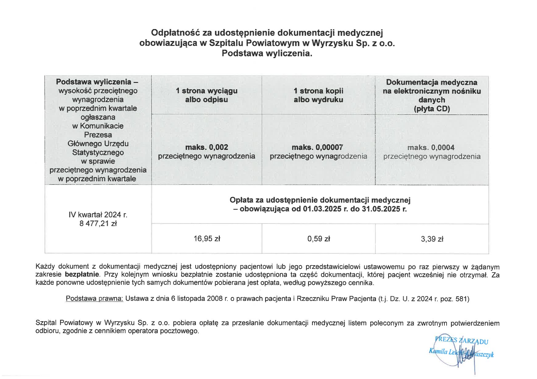 - Odpłatność za udostępnienie dokumentacji Medycznej w Szpitalu Powiatowym w Wyrzysku Sp. z o.o.